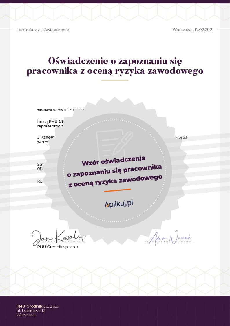 • informację, w której pracownik potwierdza, że w wyznaczonym dniu został poinformowany przez pracodawcę o ryzyku zawodowym, które wiąże się z wykonywana pracą na wyznaczonym stanowisku,