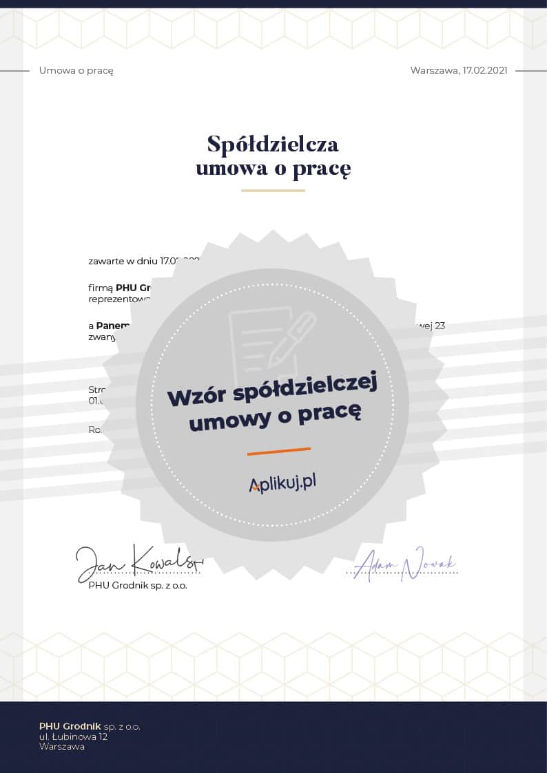 Wzór spółdzielczej umowy o pracę przygotowano zgodnie z obowiązującymi normami. Dokument stworzono w nowoczesnej i funkcjonalnej postaci z pozostawionymi miejscami na uzupełnienie danych i niezbędnych informacji dotyczących stron umowy i szczegółowych ustaleń. Aby skorzystać ze wzoru, należy pobrać bezpłatnie plik w wybranym formacie. Dokument w DOC jest edytowalny i można go przekształcić za pomocą programu MS Word oraz najczęściej stosowanych darmowych pakietów biurowych (Open Office lub Libre Office).
