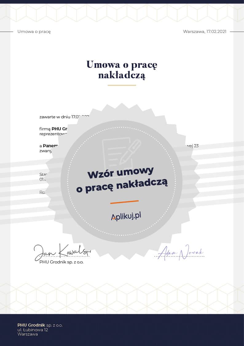Umowa o pracę nakładczą może zostać zawarta na okres próbny, określony lub nieokreślony oraz na czas wykonania określonej pracy. Aby prawidłowo sporządzić umowę o pracę nakładczą warto skorzystać z darmowego wzoru, by mieć pewność, że umowa będzie zawierać wszystkie najważniejsze elementy.