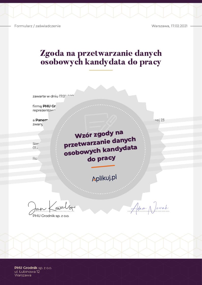 Prawo pracy i RODO nie wskazują obligatoryjnego szablonu wyrażenia zgody na przetwarzanie danych osobowych kandydata do pracy, dają jednak przykłady, jak może ona wyglądać. Opisywana zgoda może zostać wyrażona w formie oficjalnej formułki ze wskazanie konkretnej podstawy prawnej, na której się opiera. Może być również napisana znacznie prostszym językiem i zawierać się w jednym, konkretnym zdaniu. Zamieszczenie w CV prawidłowo sformułowanej i wskazującej aktualne przepisy prawa zgody na przetwarzanie danych osobowych ułatwia skorzystanie z bezpłatnego wzoru.