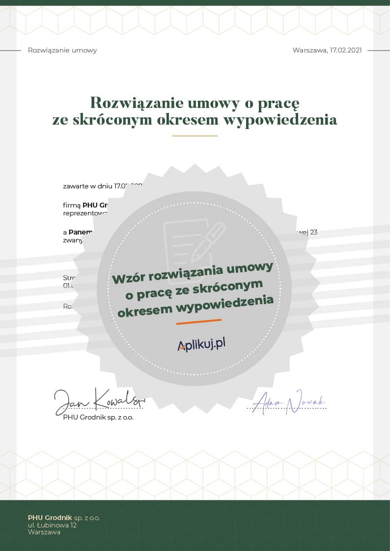 Wzór dokumentu rozwiązania umowy z zastosowaniem skróconego okresu wypowiedzenia udostępniamy do pobrania w dwóch formatach do wyboru. Aby skorzystać z szablonu, pobierz plik i wydrukuj w celu odręcznego uzupełnienia danych bądź zedytuj plik .doc samodzielnie w jednym z popularnych pakietów biurowych (MS Office, Open Office lub Libre Office).