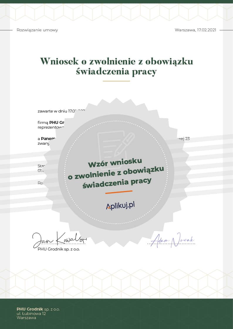 Będąc pracownikiem, można u pracodawcy złożyć wniosek o zwolnienie z obowiązku świadczenia pracy po otrzymaniu wypowiedzenia. Pracodawca taki wniosek może przyjąć albo odrzucić. Może też zobowiązać pracownika do wybrania zaległego urlopu i udzielić zwolnienia z obowiązku świadczenia pracy na pozostały okres wypowiedzenia umowy o pracę. We wniosku należy podać podstawę prawną, a więc art. 362 k.p., zaznaczyć kiedy otrzymało się wypowiedzenie. W górnej części dokumentu po lewej stronie należy podać imię i nazwisko oraz stanowisko, a z prawej strony miejscowość datę, a poniżej dane pracodawcy. Potem wpisuje się tytuł wniosku, a następnie jego treść. Najczęściej z inicjatywą zwolnienia z obowiązku świadczenia pracy wychodzą pracodawcy, wtedy dokument nie ma formy wniosku, a oświadczenia.