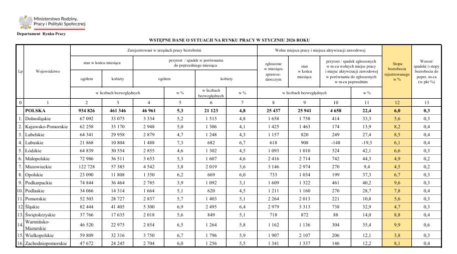 Z aktualnych danych wynika, że stopa rejestrowanego bezrobocia w Polsce wynosi 6%, a osób bezrobotnych jest 934,8 tysięcy.