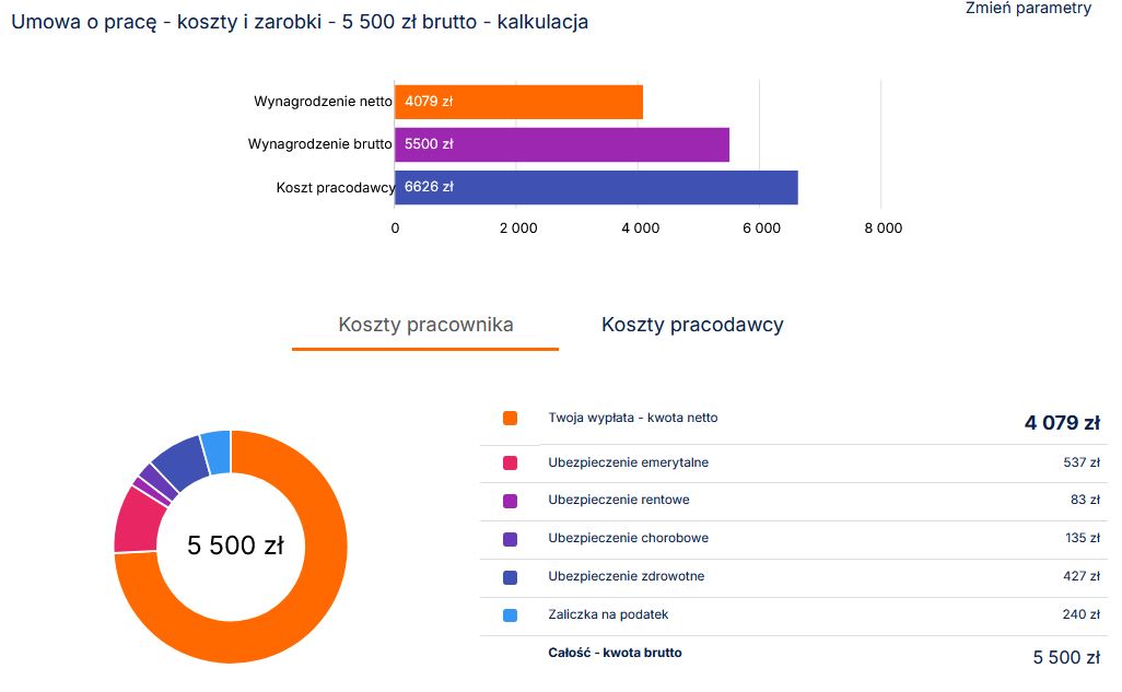 Przykładowa kalkulacja kwoty netto, kosztów pracodawcy oraz wysokości poszczególnych składek odprowadzanych przez pracodawcę za pracownika w naszym kalkulatorze.