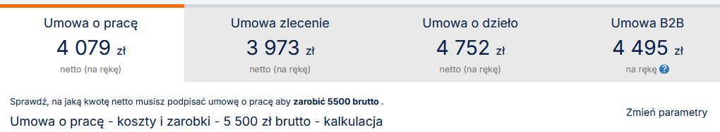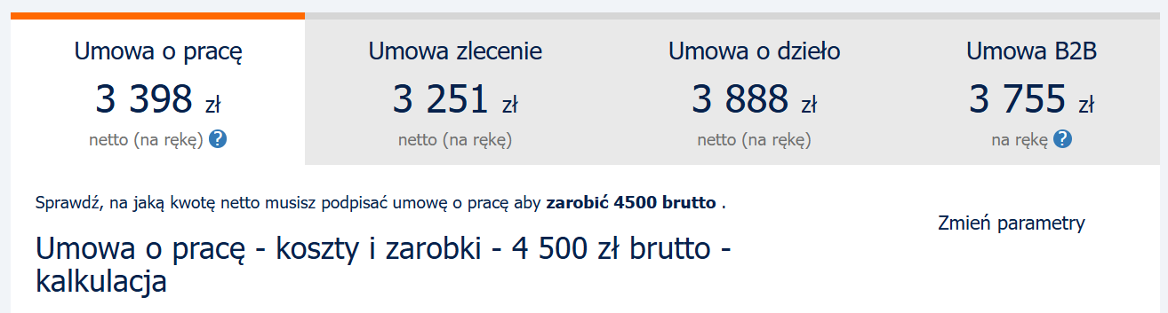Przykład kalkulacji kwoty netto z kwoty brutto (4500 zł) w zależności od rodzaju umowy. Źródło: https://www.aplikuj.pl/kalkulator-wynagrodzen/