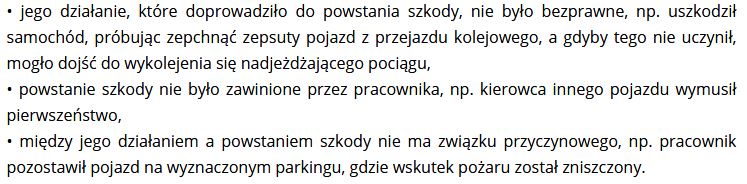 Z punktu widzenia każdego zatrudnionego istotne jest, że może się on uwolnić od odpowiedzialności za szkodę w mieniu powierzonym, ale tylko wówczas, gdy powstała ona z przyczyn, które nie zostały wywołane jego działaniem lub zaniechaniem. Co więcej, to na pracowniku spoczywa obowiązek udowodnienia, że nie ponosi on odpowiedzialności. Zgodnie z art. 124 § 3 Kodeksu pracy, osoba zatrudniona może się od odpowiedzialności uwolnić, jeżeli wykaże, że szkoda powstała ?z przyczyn od niego niezależnych, a w szczególności w wskutek niezapewnienia przez pracodawcę warunków umożliwiających zabezpieczenie powierzonego mienia?. W praktyce mowa tu choćby o ewentualnym zgłoszeniu pracodawcy zauważonych usterek, które mogą wpłynąć na sprawność pojazdu. Ta zasada odnosi się także do czynników atmosferycznych panujących w dniu wypadku (na przykład mgły czy deszczu, które ograniczały widoczność na drodze) lub stanu nawierzchni. Takie stanowisko zaprezentował Sąd Najwyższy w wyroku z dnia 20 października 2009 roku (sygn. akt I PK 87/09).