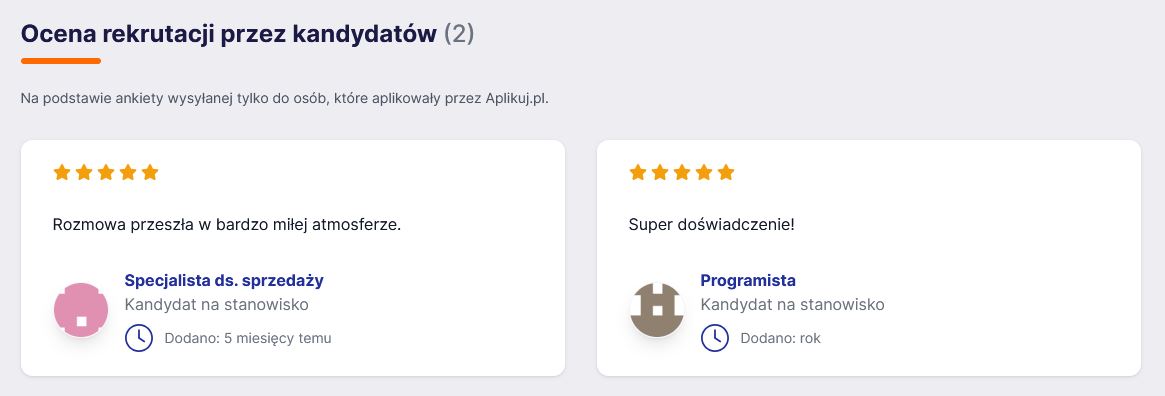 Po zakończonej rekrutacji kandydat otrzyma maila z krótką ankietą. Zebrane dane pozwalają na analizę procesów rekrytacyjnych w firmie i poprawę standardów. Usługa ta jest całkowice bezpłatna. Ty nie musisz nic robić, a informacje o wrażeniach kandydatów spływają i pojawiają się na Twoim profilu w portalu Aplikuj.pl. Teraz mając już odpowiednie dane, możesz działać - postaw na poprawę procesów rekrutacyjnych i ciesz się napływem wartościowych pracowników do Twojej firmy.