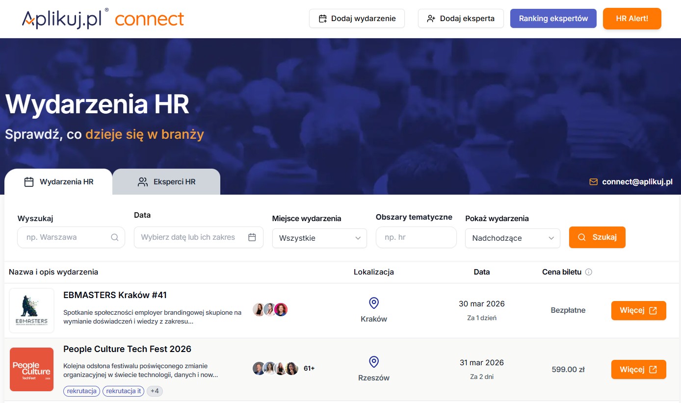 Aplikuj Connect to nowy projekt rozwijany przez zespół Aplikuj.pl, którego celem jest stworzenie centralnego miejsca dla branży HR. Serwis został pomyślany jako przestrzeń, w której użytkownicy mogą zarówno śledzić wydarzenia branżowe, jak i poznawać ekspertów aktywnych na konferencjach, webinarach czy szkoleniach. Na stronie dostępne są dwie główne sekcje: wydarzenia HR oraz eksperci HR, a sama wyszukiwarka pozwala filtrować treści m.in. według daty, miejsca i obszarów tematycznych.