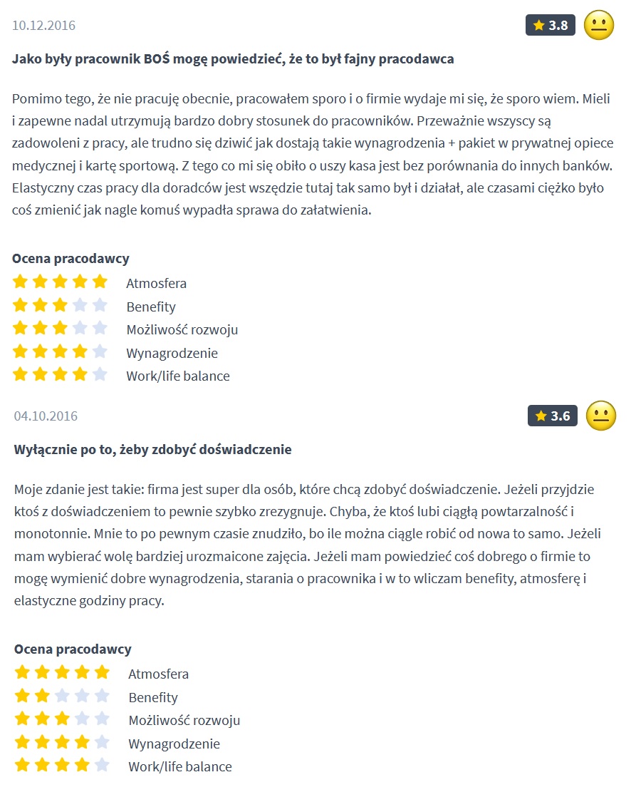 Na pewno odnośnie atmosfery największe znacznie ma oddział. Nie w każdej filii musi panować atmosfera wiecznej konkurencji. Z pewnością osoby chcące zacząć przygodę z bankowością mogą spróbować swoich sił w BOŚ. Taką pracę zawsze można potraktować jako przystanek w drodze budowania kariery.
