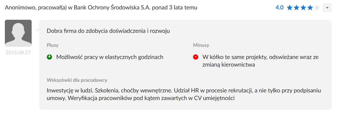 Szukając pracy, każdy próbuje się najpierw dowiedzieć czegoś o potencjalnych pracodawcach. Zazwyczaj dostęp do pracowników w celu rozmowy o warunkach i atmosferze jest utrudniony, więc większość osób szuka informacji w sieci. Z pomocą przychodzą portale zbierające opinie o pracodawcach. Często stają się one platformą do wylewania żali, ale wśród wpisów da się znaleźć opinie rzetelnie opisujące warunki. Co piszą w sieci o Banku Ochrony Środowiska?