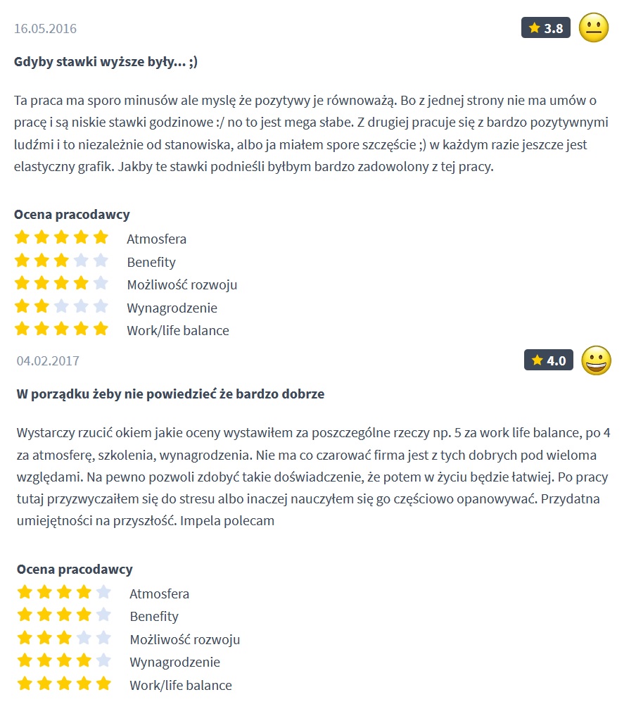 Jak widać, wiele zależy od konkretnej spółki, stanowiska i branży. Osoby pracujące na najniższych stanowiskach firm zajmujących się sprzątaniem czy ochroną narzekają na czas pracy oraz niskie wynagrodzenia. Z drugiej strony wiele wypowiedzi o Grupie Impel mówi o cennym doświadczeniu i rozwoju. Zapewne w przypadku wyższych stanowisk w bardziej zaawansowanych zawodach warunki są bardziej atrakcyjne.