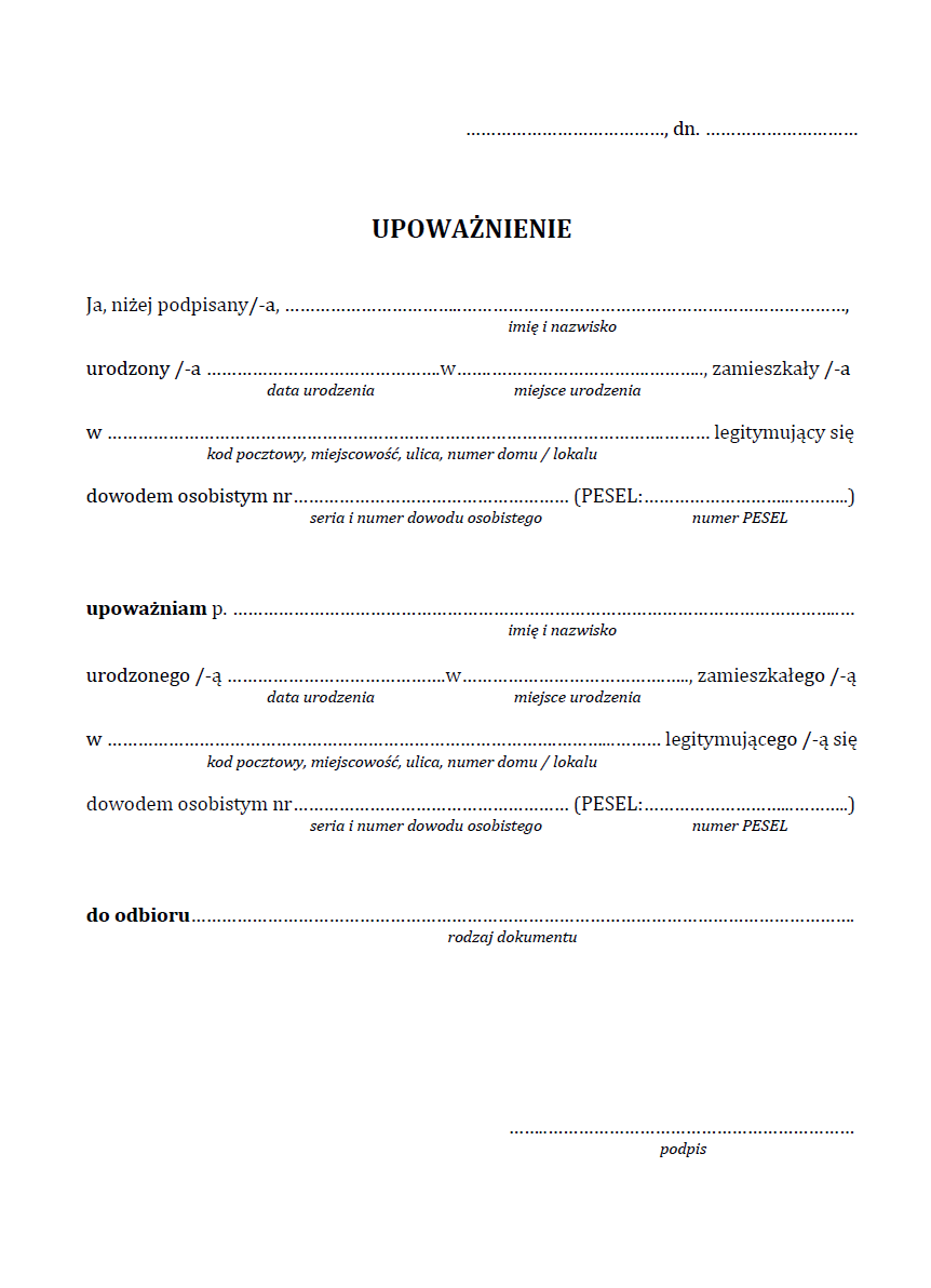 - dane osoby, która upoważnia oraz dane osoby, która jest upoważniana - wskazujemy tutaj ich imiona i nazwiska, numer PESEL oraz numer dowodu osobistego;