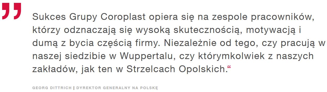Grupa Coroplast prowadzi duże zakłady produkcyjne w województwie opolskim, co sprawia, że jest atrakcyjnym pracodawcą na lokalnym rynku. Wiele wskazuje jednak, że praca w spółkach należących do tego koncernu powinna być przystankiem w rozwoju kariery i miejscem zdobywania doświadczenia, aniżeli mariażem na długie lata.