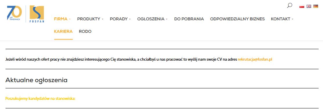 W przypadku braku oferty na interesujące stanowisko Fosfan zachęca do złożenia spontanicznej aplikacji. Te mogą być wysyłane na adres mailowy rekrutacja@fosfan.pl.