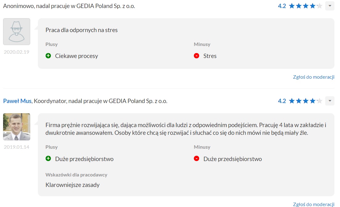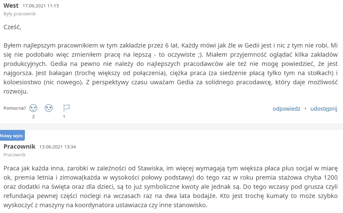 Firma Gedia Poland Sp. z o.o. jest również komentowana w sieci i wpisy mają różny wydźwięk. Wygląda jednak na to, że firma zmaga się ze zwykłymi problemami dużych zakładów produkcyjnych. Część osób podkreśla, że Gedia Poland nie jest ani najlepszym pracodawcą w branży, ani też najgorszym.
