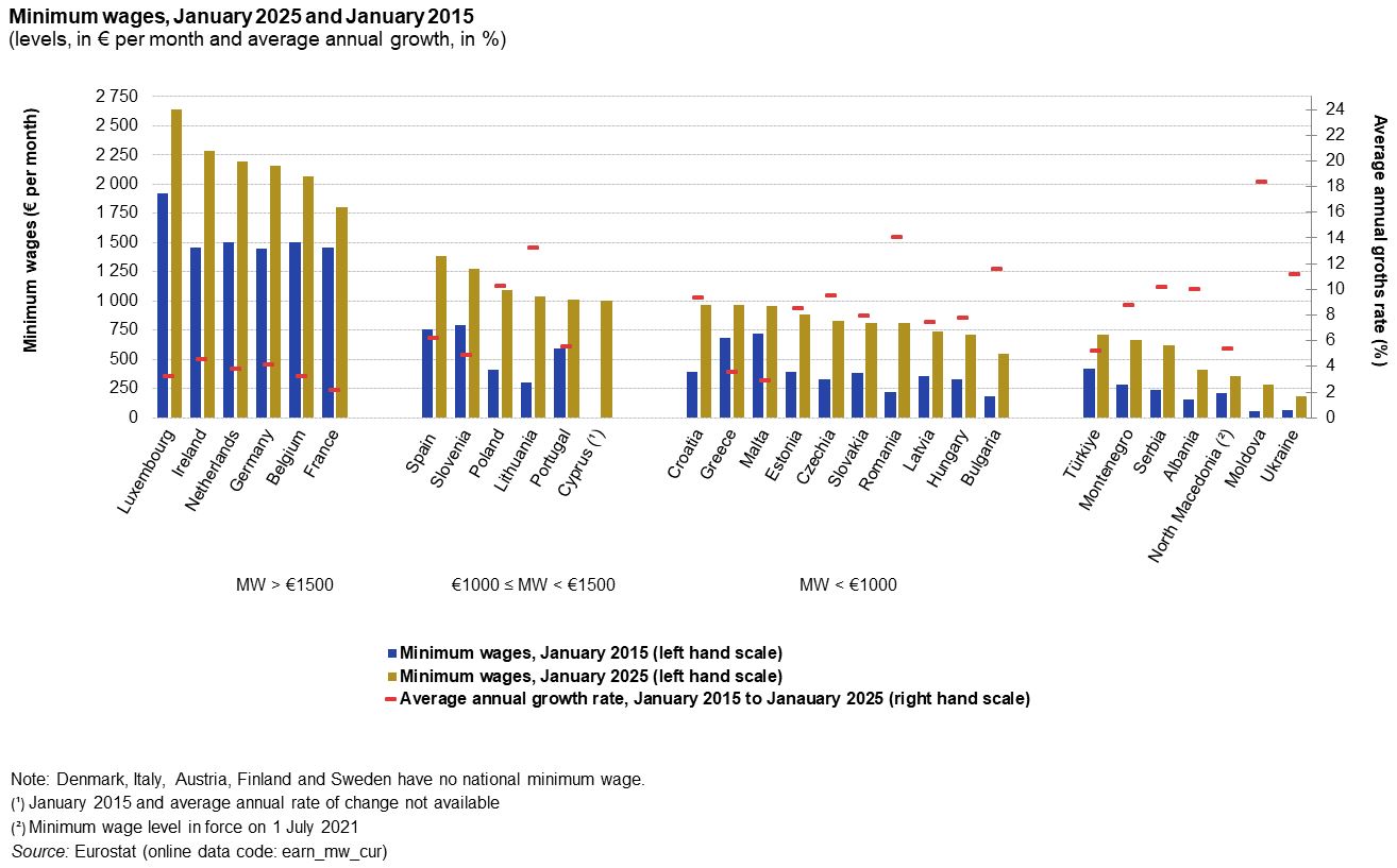 Obecnie aż 21 krajów Unii Europejskiej posiada gwarantowane, minimalne wynagrodzenie. Niestety, zgodnie z danymi Eurostatu, różnice pomiędzy nimi mogą być nawet siedmiokrotne. Zgodnie ze stanem, mającym miejsce 1 stycznia 2025 roku, w 10 krajach UE płaca minimalna była niższa niż 1 000 euro (około 4 100 złotych). Najmniej zarabiają obywatele Bułgarii - nieco ponad 500 euro miesięcznie, Węgrzy i Łotysze - około 750 euro, a także Rumuni i Słowacy - niespełna 800 euro. Najlepiej zarabiają obywatele Luksemburga - 2 600 euro (około 11 000 złotych), Irlandii - 2 250 euro (około 9 400 złotych), a także Holendrzy - 2 150 euro (około 9 000 złotych).