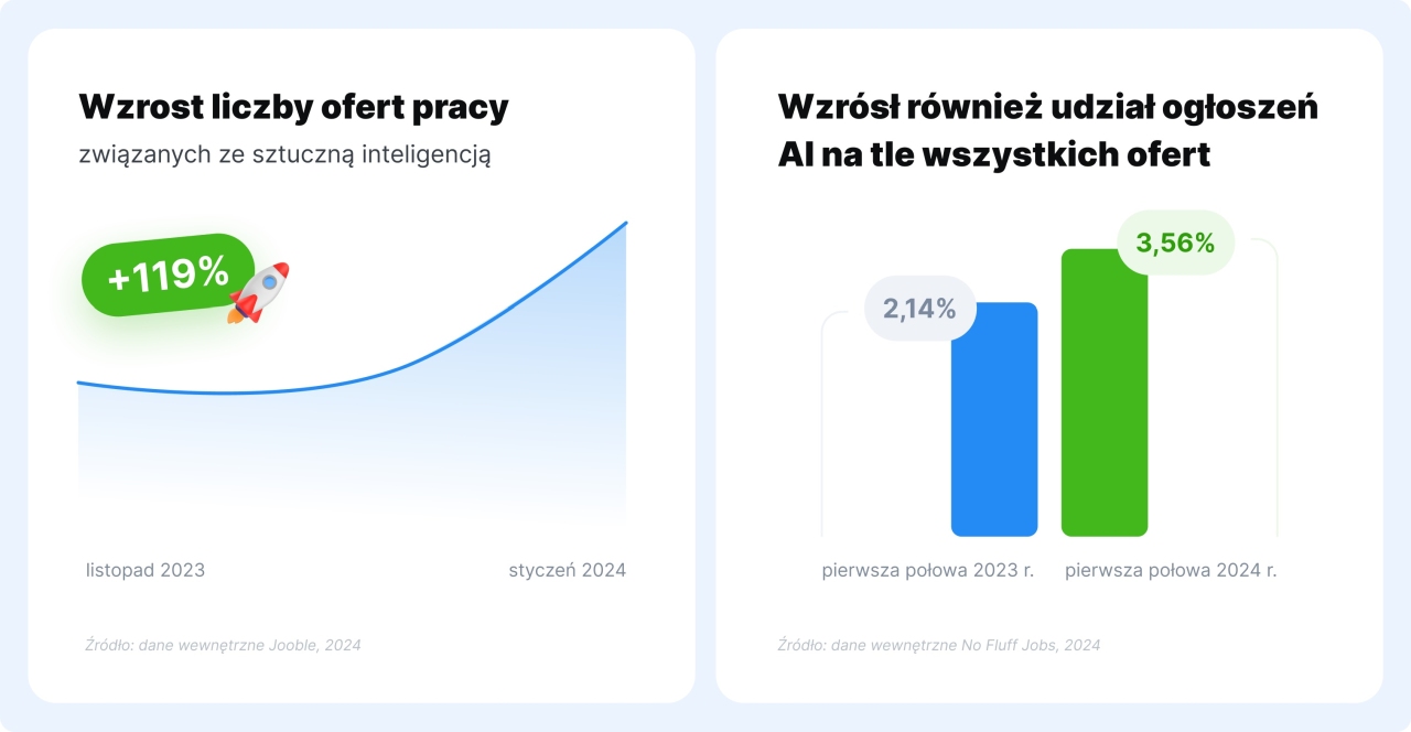 Wykresy wzrostu ogłoszeń o pracę związnych ze sztuczną inteligencją. Źródło: https://pap-mediaroom.pl/biznes-i-finanse/gwaltowny-wzrost-liczby-ofert-pracy-zwiazanych-ze-sztuczna-inteligencja-kogo