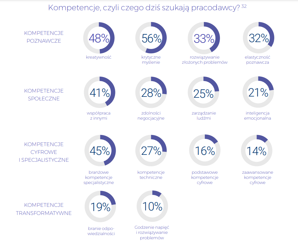 Oczywiście nie oznacza to, że eksperci nie są poszukiwani. Według raportu Future Jobs 2024 nadal 45% pracodawców szuka pracowników ze specjalistycznymi kompetencjami branżowymi. Nic dziwnego, w końcu bez profesjonalistów nie sposób rozwijać specjalistycznych usług czy produktów! Mimo to, aż 48% pracodawców poszukuje również osób kreatywnych, które nie boją się zmian i potrafią się do nich dostosowywać.