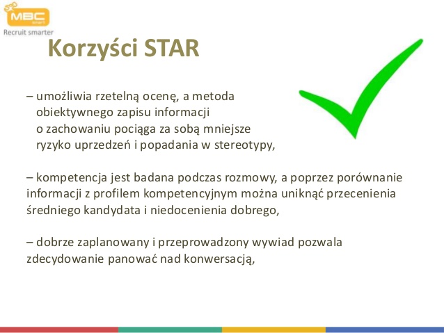 Metoda wywiadu kompetencyjnego STAR daje kandydatowi możliwość zaprezentowania swoich kompetencji, jeśli posiada on odpowiednie umiejętności prezentacyjne. Dużą rolę odgrywają tutaj zdolności interpersonalne, wskazana jest jak największa pewność siebie, łatwość w mówieniu o swoich dotychczasowych sukcesach, umiejętnościach i zaletach.